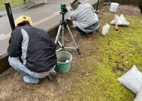 高さが均一になるように、レベルをチェックしながら水平と垂直も見ながらの施工となります。
