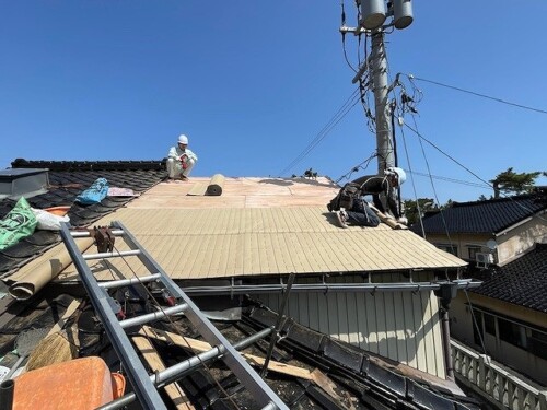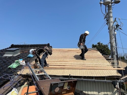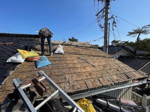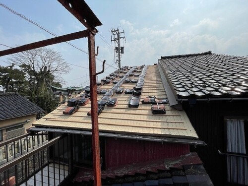 瓦の下地が見えてきたら瓦を固定していた横の桟も撤去します。
